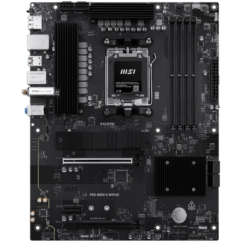MSI PRO B850-S WIFI6E, ATX, Socket AM5, 4x DDR5 Dual Channel up to 8200(OC)MHz, 2x PCIe x16 slot, 2x M.2 slot, 4x USB 5Gbps, 3x USB 10Gbps, 1x USB 10Gbps Type-C, HDMI, DP, 7.1 HD Audio, 2.5G LAN, WiFI 6E, BT, 3Y