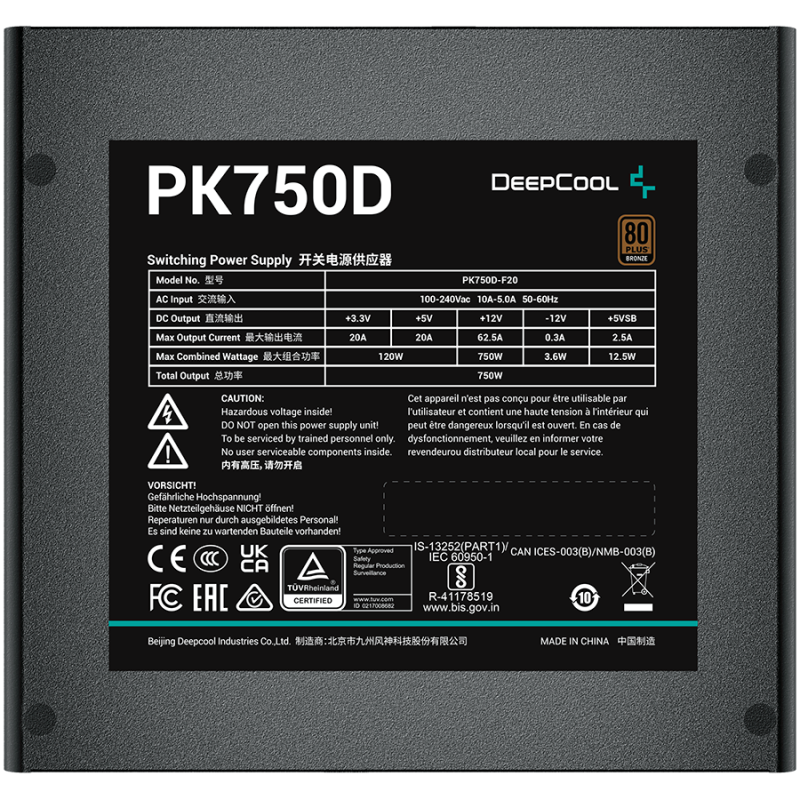DeepCool PK750D, 750W, 80 Plus BRONZE, Taiwanese Capacitors, Flat Black Cables, 120mm Fan, SCP/OPP/OTP/OVP/OCP/UVP, 5Y, R-PK750D-FA0B-EU