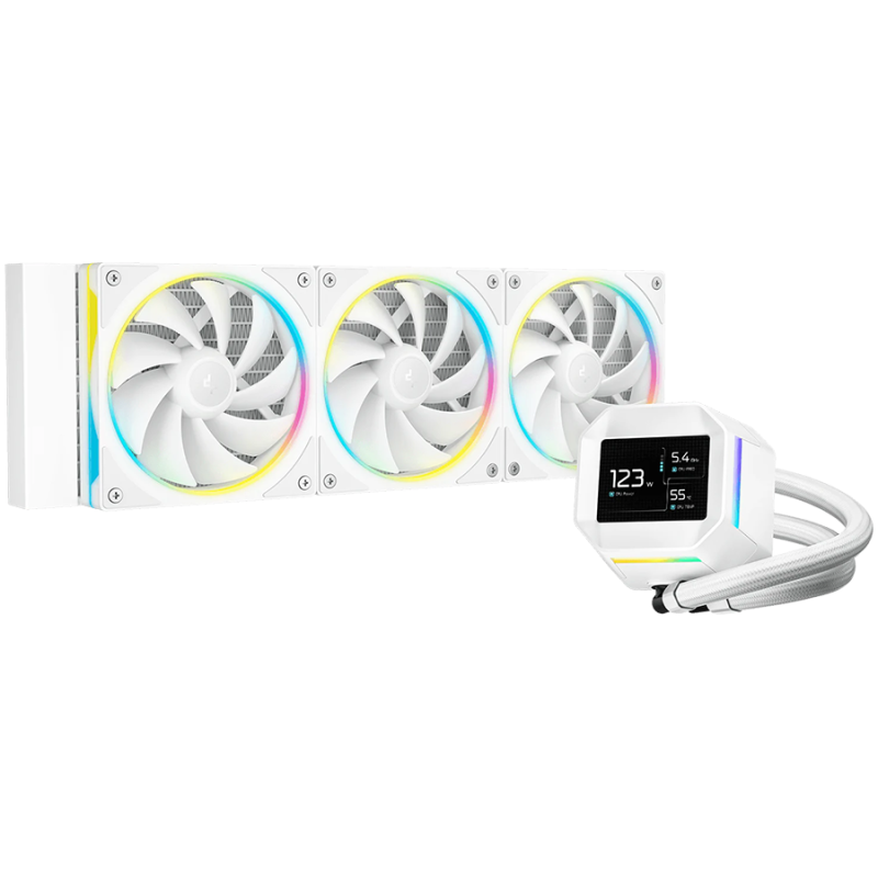 DeepCool LM360 WH, 360mm CPU Liquid Cooler, 2.4" LCD screen, 3x120mm FL12 SE ARGB PWM Fans, Fluid Dynamic Bearing, White, Intel LGA1851/1700/1200/1151/1150/1155, AMD AM5/AM4, R-LM360-WHDMMC-1, 3Y