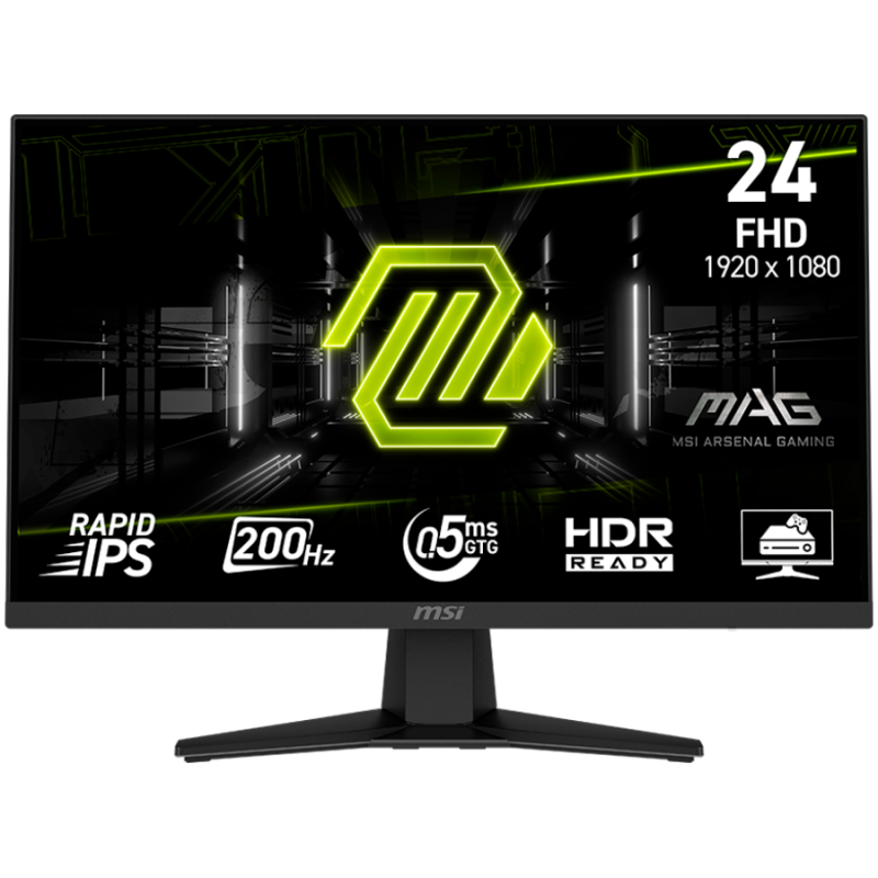 MSI MAG 244F Gaming Monitor, 23.8" 200Hz, FHD (1920x1080) 16:9, Rapid IPS Anti-glare, 0.5ms, 300nits, 1000:1, 178/178, AMD FreeSync Premium, Tilt, 1x DP, 1x HDMI, 1x Headphone-out, 3Y Warranty